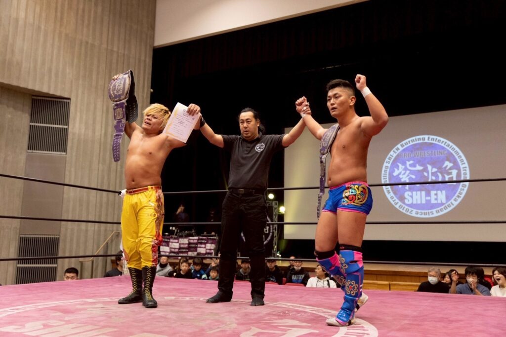 大久保さんとのタッグWINSでNOTORIOUSのマロ栗山・ライパチ磯部の持つタッグベルトに挑戦。